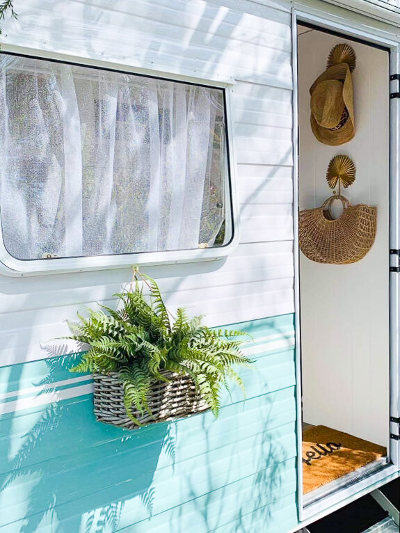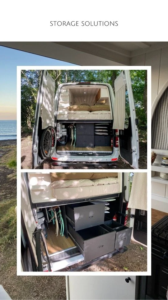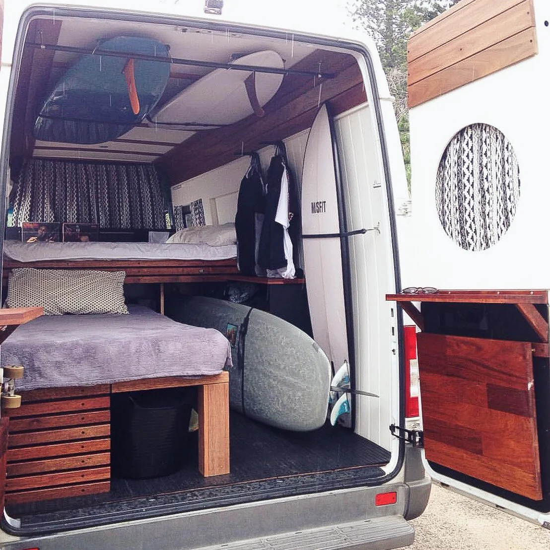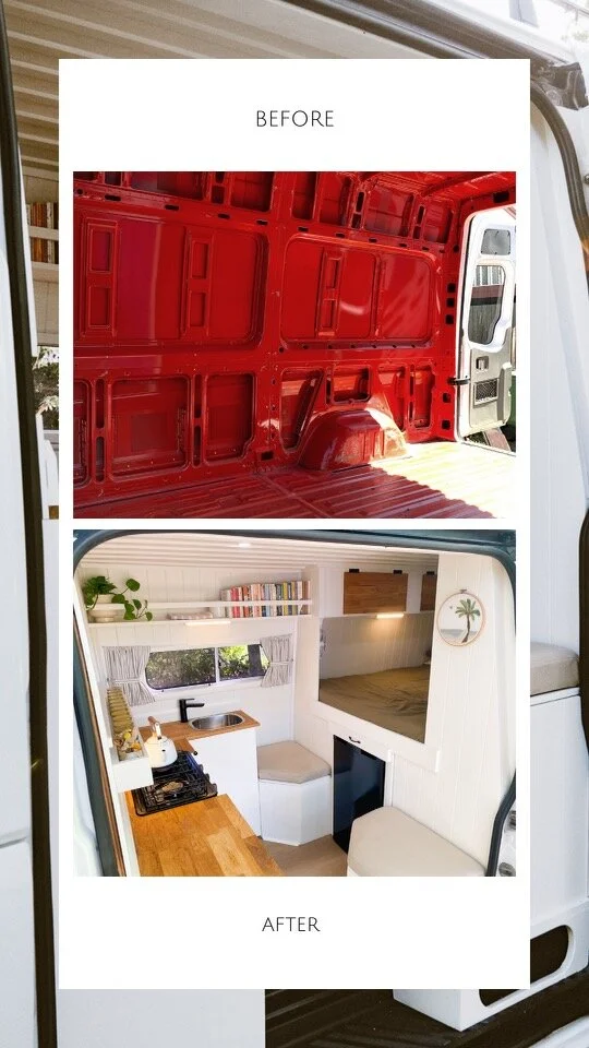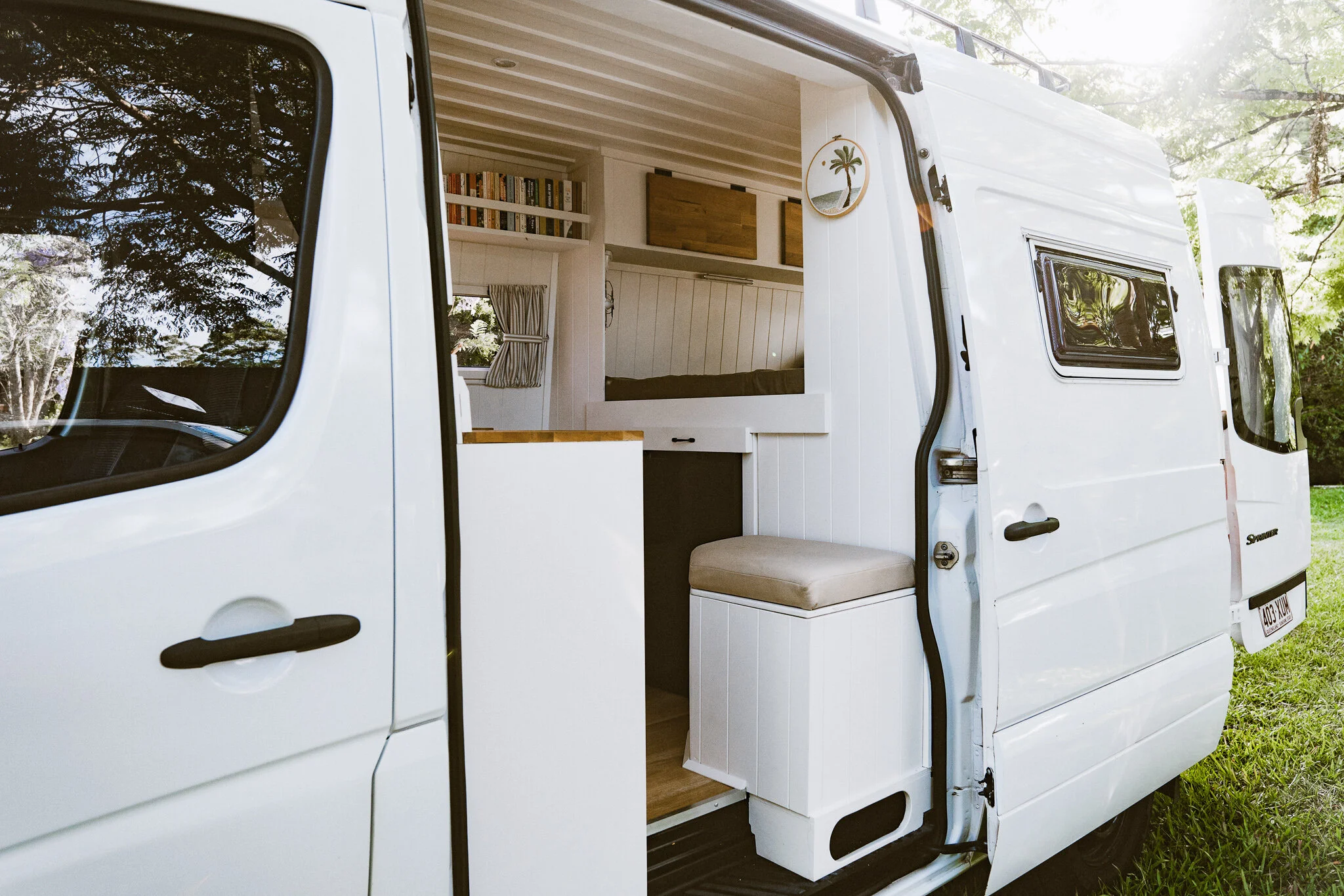 Interior of a minimalist white camper van with wooden accents, featuring a stove at the forefront, shelves with jars and spices, a small plant, and a compact fan on the wall.