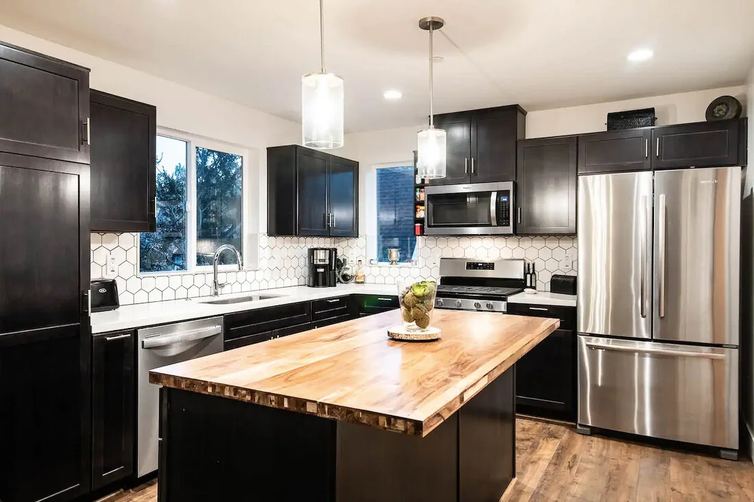 Modern kitchen interior seen through a window, featuring a gold faucet, wooden countertop, white cabinetry, and tiled backsplash.