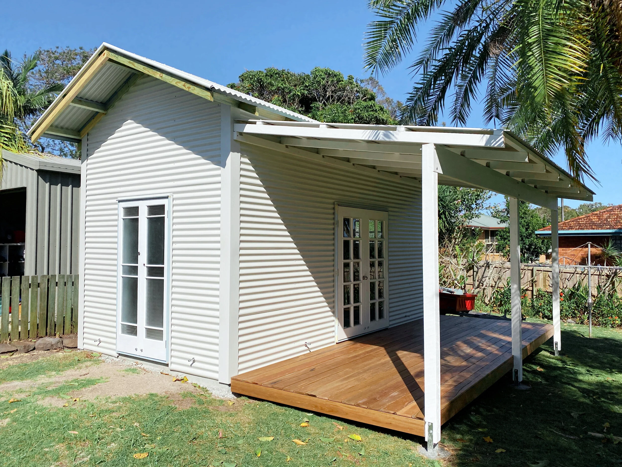 Small white corrugated metal tiny house or shed with a wooden deck, set in a grassy yard with tropical trees, featuring French doors and a simple overhang.